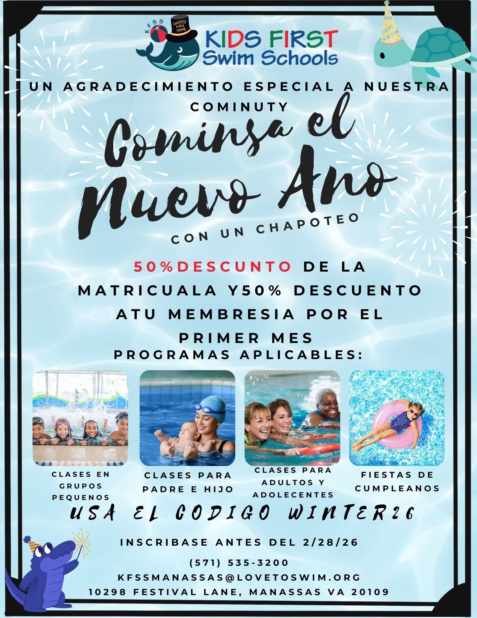Inscríbete en cualquier clase de natación en grupo ahora hasta el 28 de febrero y reciba un 50% de descuento en las tasas de matrícula y de membresía, además acceso GRATUITO a la horarios de natación familiar durante su primer mes!