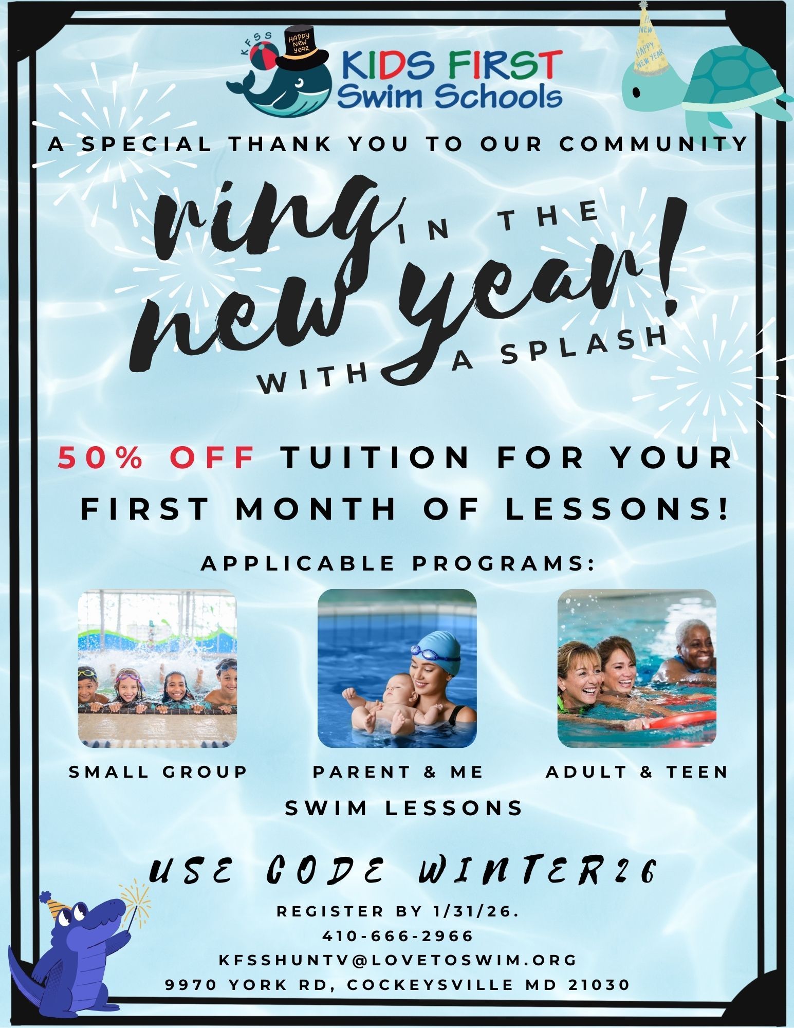 Sign up for any group swim lesson now through end of January and receive 50% OFF tuition, plus FREE Family Swim access during your first month!
