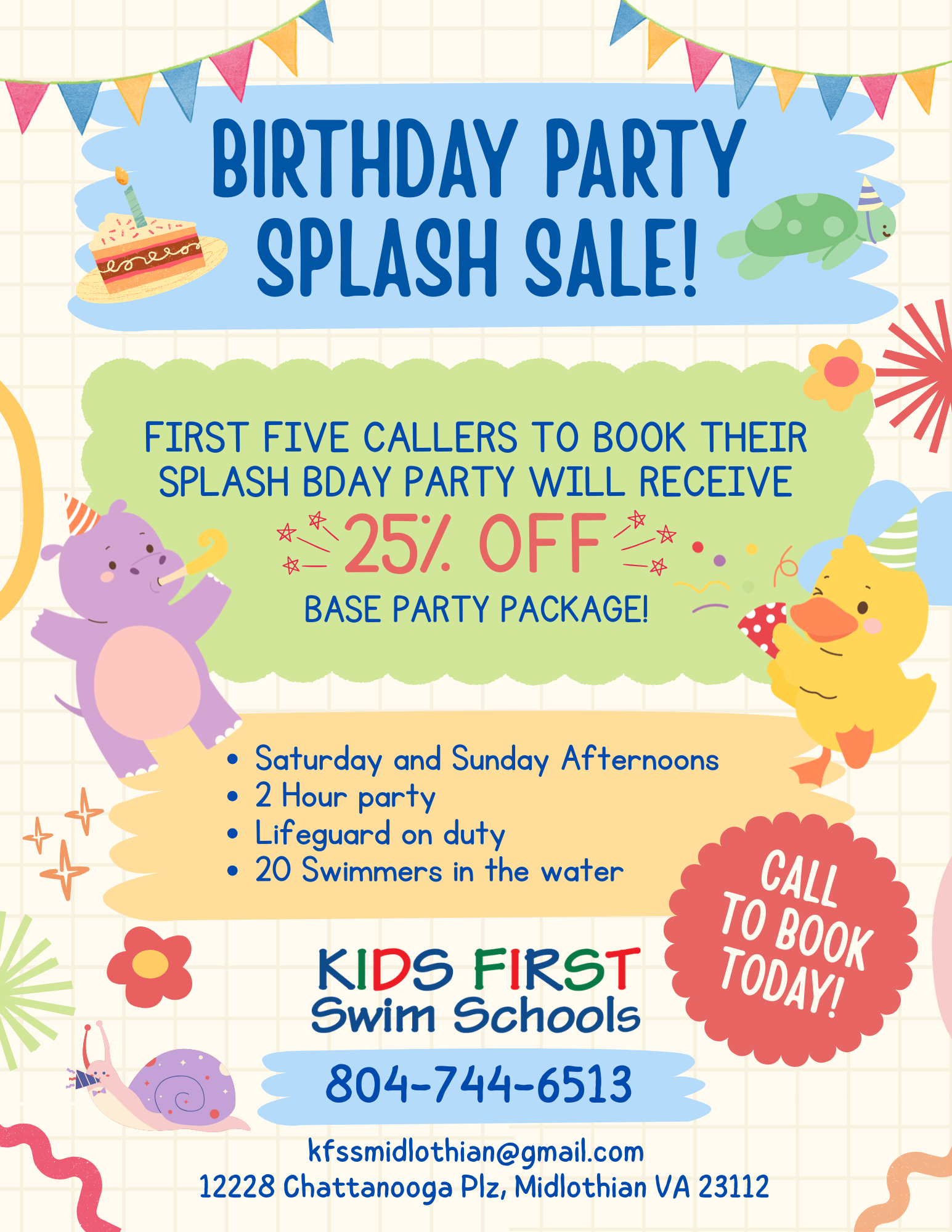 First Five callers to book their Splash Birthday Party will receive 25% off a Base Party Package!