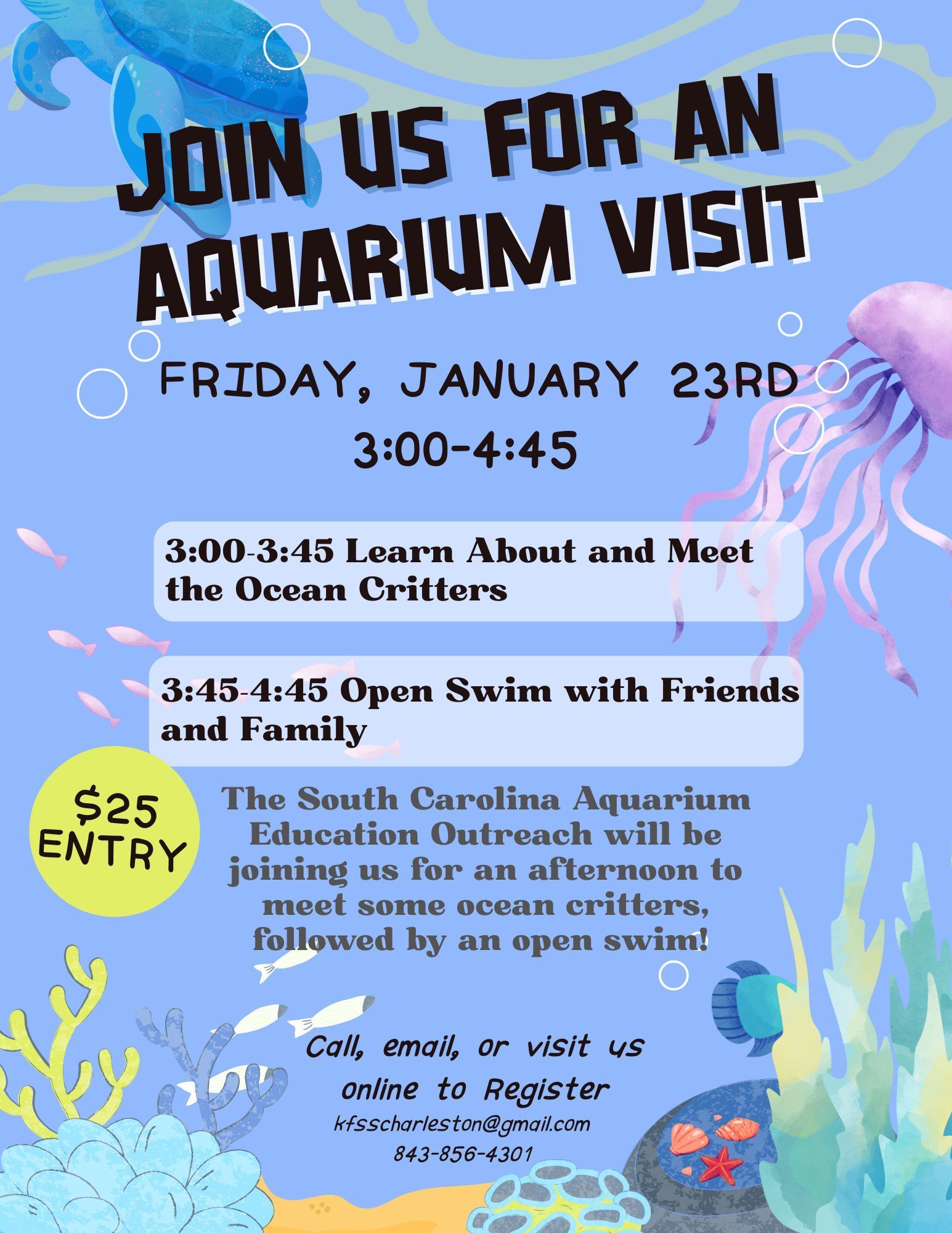 - Event includes learning portion and meeting ocean critters, and open swim time